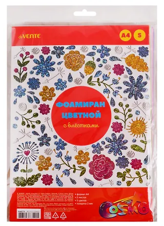 Фоамиран цветной с блёстками A4 deVENTE 5 цв, 5 л, толщина 2 мм, пластиковый пакет с европодвесом