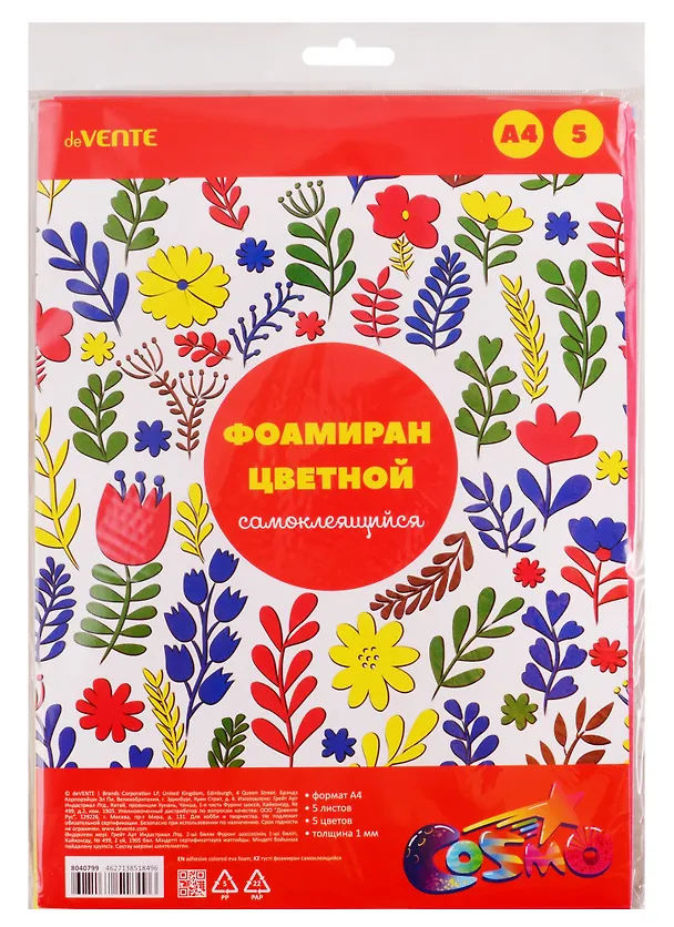Отличный материал для творчества. Цвета не слишком яркие, скорее немного припыленные, но для поделок с детьми вполне хороши. Толщина 1 мм. С одной из сторон клейкий слой, закрытый защитной бумагой, так что можно не возиться с клеем. Всего в наборе 5 цветов: красный, белый, синий, зеленый, желтый. Как раз что надо, чтобы оформить детскую поделку, а если надо что-то черное (например, зрачок у глазок), можно дорисовать перманентным маркером. Толщина 1мм, так что поделки получаются не только симпатичными, но и мягкими и приятными на ощупь.