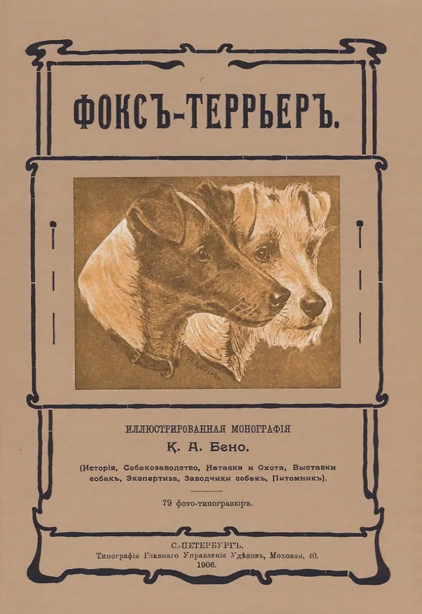 .История, фокстерьера, собаководство, натаска и охота, выставки и экспертиза, устройство питомника собак. и т. д., реклама. 79 фотогравюр. Иллюстрированная монография К. А. Бено, члена - основателя и секретаря Русского Общества Любителей Фокс террьеров и Такс, действительного члена Австро-Венгерского и Германского Фокс-террьер клубов, Германского кружка заводчиков Фокс-террьерови Финского Кеннель клуба.