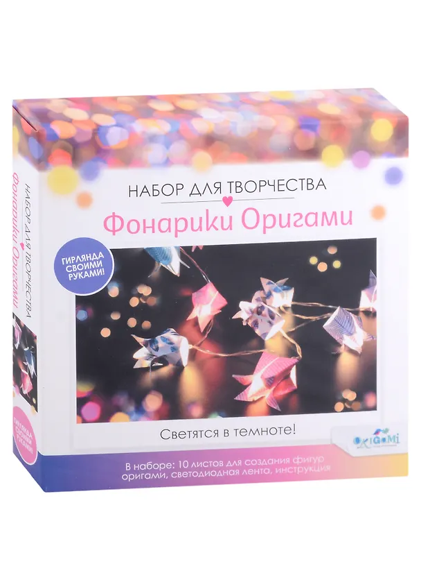 В наборе: 10 листов для создания фигур оригами, светодиодная лента, инструкция.