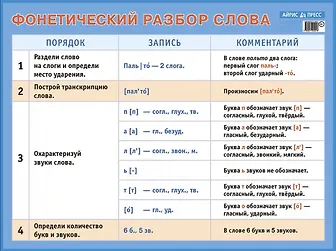 Новая от 26.12.2011: Это наглядное пособие универсально: плакат является самостоятельной частью комплекта по русскому языку для начальной школы и может быть использован как необходимое дополнение ко всем существующим сегодня курсам. Пособие отвечает Требованиям ФГОС, реализует в полном объеме деятельностный подход в обучении. На красочно оформленном плакате представлена таблица фонетического разбора слова, которая включает не только порядок (алгоритм) разбора слова и его запись, но и устный комментарий. Комментарий в структуре фонетического разбора, транскрипция слова существенно повышают функциональность и эффективность таблицы, как наглядного средства.