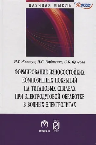 В монографии представлены результаты исследования процесса формирования на титановых сплавах износостойких композитных покрытий на основе карбида титана при электродуговой обработке в водных электролитах. Показаны закономерности изменения состава, структуры и функциональных свойств поверхности в процессе обработки, а также при легировании двух-компонентной системы Ti-TiC переходными и вентильными металлами. Приведены теоретические представления процесса плазменной обработки металлической поверхности, включающие рассмотрение физико-химического механизма и термодинамический анализ формирования фазы карбида титана в объеме титанового сплава. Показаны некоторые перспективы практического применен