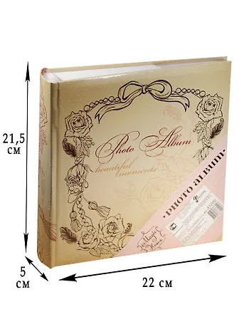 Обложка альбома выполнена из картона и оформлена изображением виньетки. Внутренний блок содержит 50 листов форматом 22*22см на 200 фотографий. Листы из бумаги c кармашками-держателями из ПВХ для фото, с полями для записей и книжным переплетом. Фотоальбом является универсальным подарком к любому празднику.