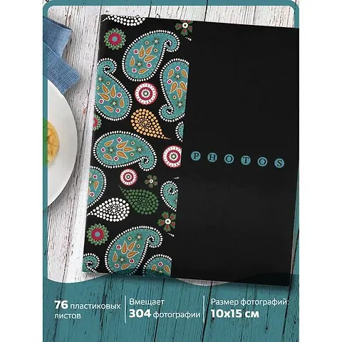 Фотоальбом BRAUBERG на 304 фото 10*15 см, твердая обложка, Пейсли, черный с голубым