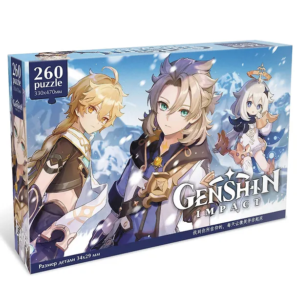 Пазл 260 элементов станет отличным подарком для поклонников известной лицензии «Genshin Impact». На пазлах представлены главные герои популярной во всём мире игре. Сборка пазлов развивает внимательность и усидчивость, а также является отличным занятием для всех возрастов. Соберите всю коллекцию!