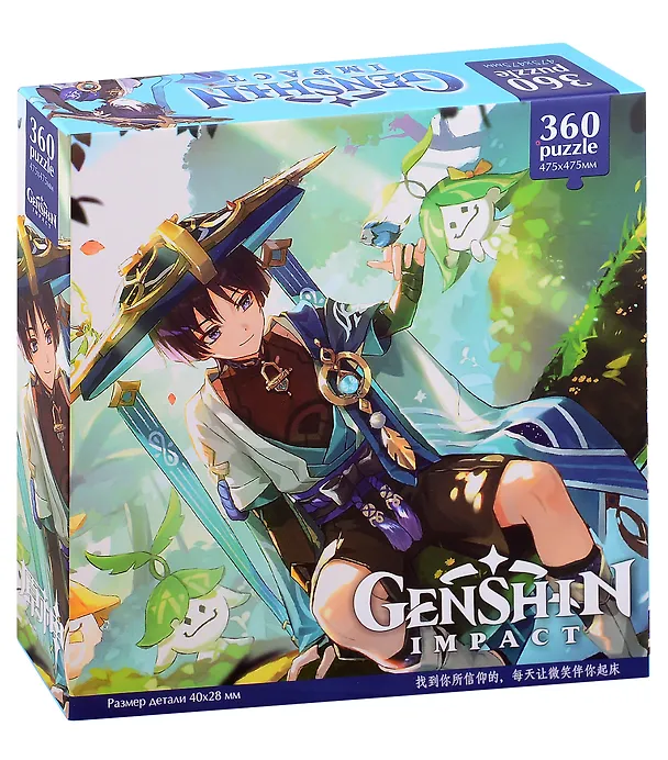 Пазлы выполнены в дизайне лицензии «Genshin Impact», имеющей огромную популярность во всем мире. Удобный формат – квадратный пазл из 360 элементов впишется в любой интерьер. Качественные материалы и полиграфия, хорошая сцепка деталей.
