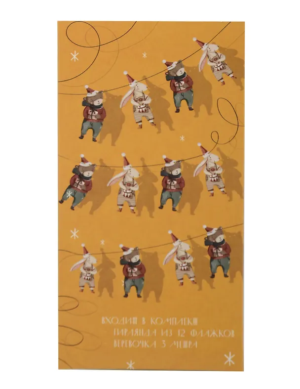 Праздничная картонная гирлянда с милыми изображениями Зайки и Медвежонка — уютное украшение для создания тёплой, доброжелательной атмосферы в преддверии праздников или для повседневного декора детского пространства. Изделие сочетает простоту оформления с очарованием ручной эстетики, подходит для оформления интерьеров, ёлок и тематических мероприятий.