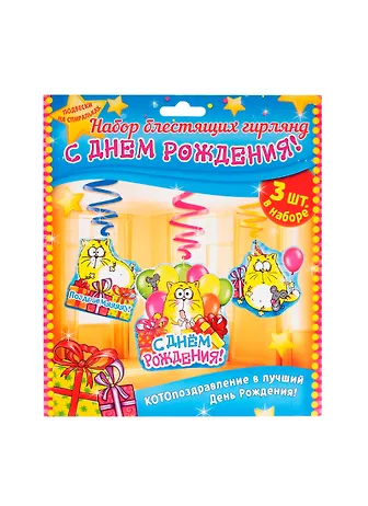.Набор гирлянд на спиралях "С днем рождения!" (Котэ) с авторским дизайном и тёплым пожеланием создаст незабываемую атмосферу торжества! Набор состоит из 3 изделий на блестящих спиралях, отличающихся оригинальной формой и яркостью печати.