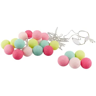 Красивое освещение сделает любую комнату милой и уютной. Чтобы добавить света в комнату, выберите гирлянду с шариками цветочных оттенков. Они напоминают маленькие клубочки ниток. Стоит включить гирлянду в розетку, как шары засветятся изнутри нежным жёлтым светом. Яркая гирлянда украсит вашу гостиную или спальню.