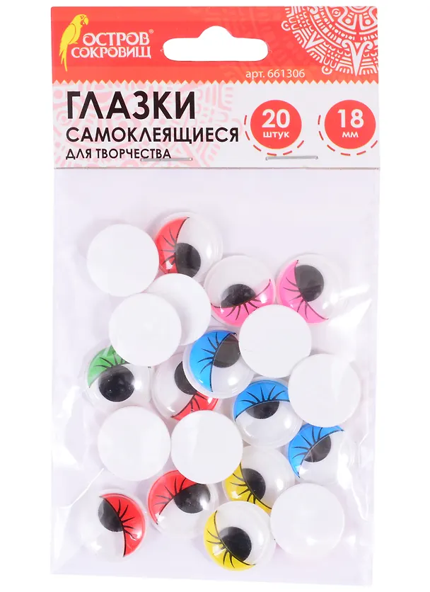 Глазки с ресницами самоклеящиеся вращающиеся для творчества (18 мм) (20 шт) (5 цв.) (3+) (661306) (упаковка) (Остров сокровищ)