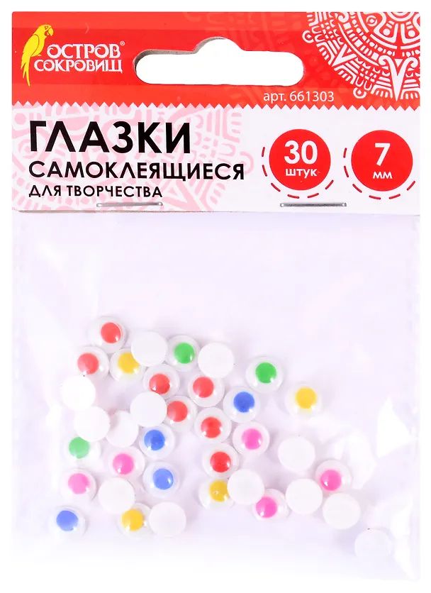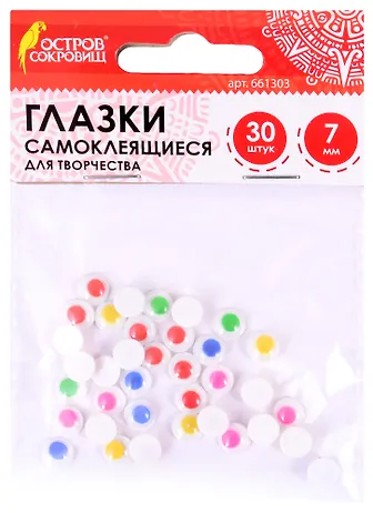Глазки самоклеящиеся вращающиеся для творчества (7 мм) (30 шт) (5 цв.) (3+) (661303) (упаковка) (Остров сокровищ)