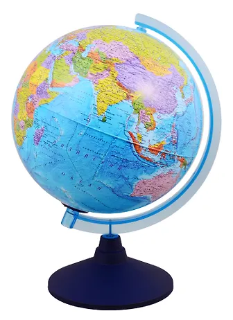 Хороший диаметр глобуса, Крупный шрифт в названиях стран и океанов, красочный, поскольку политический - разные страны по традиции раскрашены разными цветами.