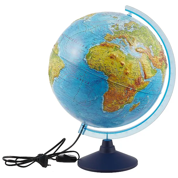 Очень удобный физический глобус! Отражает рельеф как суши так и дна Мирового Океана, циркуляцию течений, а так же имеет подписи географических объектов.