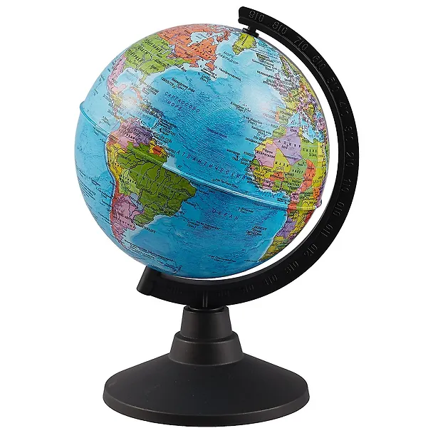 Глобус политический, диаметр 12 см - небольшое, но качественное пособие для изучения стран мира. Все названия пропечатаны чётко, легко читаются, цвета яркие. Пластик очень прочный, глобус вращается легко.