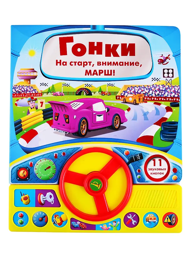 Гонки скоро начнутся! Кто же станет победителем и получит золотой кубок? Надо срочной пристегнуть ремень безопасности. Гонщику придётся мчаться к финишу на немыслимой скорости. Надо только крутить руль и нажимать на звуковые кнопки. Разобраться с их назначением помогут их изображения рядом с текстом. На старт! Внимание! Марш!