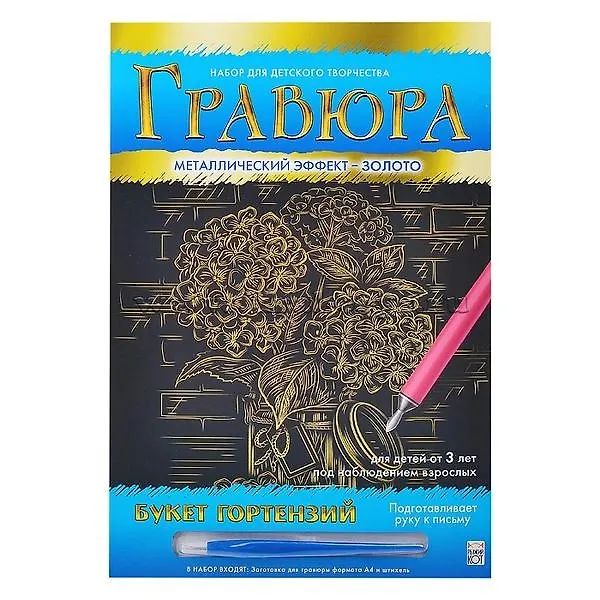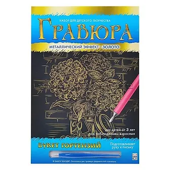 Гравюра А4 в конверте. Золото. БУКЕТ ГОРТЕНЗИЙ. Арт. Г-0507