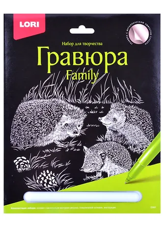 Гравюра- особый вид графического искусства. Сцарапывая верхний слой гравюры спеециальным штихелем, входящим в набор, ребенок может самостоятельно создать настоящее произведение искусства и почуствовать себя гравером. Готовую гравюру можно вставить в упаковку-рамку.