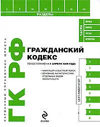 Настоящее справочно-информационное издание содержит текст всех четырех частей Гражданского кодекса Российской Федерации с изменениями и дополнениями на 1 апреля 2009 г., а также основные характеристики отдельных видов обязательств, предусмотренных частью второй ГК РФ, в том числе: их существенные условия, возможные субъекты, форма договора - письменная или устная. Книга снабжена также системой быстрого поиска статей "LEXT-навигатор", позволяющей профессиональному пользователю (юристу, студенту юридического вуза) эффективно ориентироваться в тексте закона и быстро находить нужную информацию.