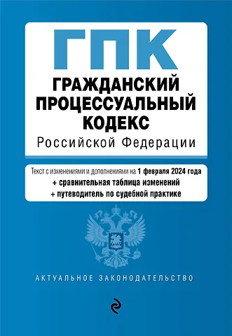 Настоящее издание содержит текст Гражданского процессуального кодекса Российской Федерации с изменениями и дополнениями на 1 февраля 2024 года с удобной навигацией и таблицей изменений. Если есть изменения, вступающие в силу позднее, то вместе с редакцией нормы, действующей на эту дату, приводится норма в новой редакции и указывается дата, с которой она вступает в силу.