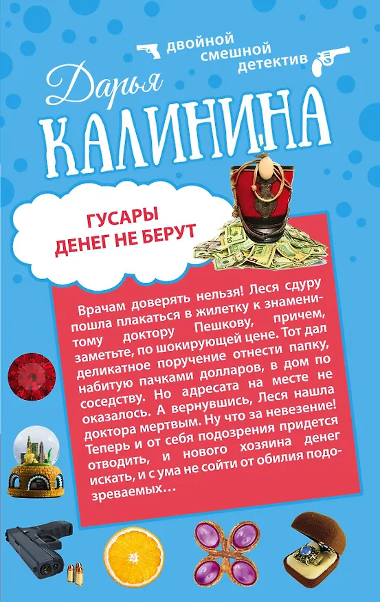 . Врачам доверять нельзя! Леся сдуру пошла плакаться в жилетку к знаменитому доктору Пешкову, причем, заметьте, по шокирующей цене. Тот дал деликатное поручение отнести папку, набитую пачками долларов, в дом по соседству. Но Адресата на месте не оказалось. А вернувшись, Леся нашла доктора мертвым. Ну что за невезение! Теперь и от себя подозрения придется отводить, и нового хозяина денег искать, и с ума не сойти от обилия подозреваемых…