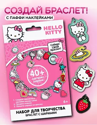 Создай свой браслет Хеллоу Китти на руку из аксессуаров. Почувствуй себя дизайнером! В наборе бижутерии есть все необходимое для создания оригинального модного украшения для девочки. Это браслет с карабином (20 см, длина регулируется), колечки более 20 шт. и паффи наклейки более 40 шт. Собрать браслет своими руками очень просто: необходимо соединить между собой все парные стикеры, продеть колечки, подвесить на браслет и украшение готово! Браслет c хэлоу кити регулируется по длине. В итоге ребенок получит красивое украшение сделанное своими руками. Набор для создания браслетов с шармами будет прекрасным подарком детям. Подойдет для детских подарков в садик. Ваша маленькая принцесса может порадовать интересным, творческим набором свою подругу, сестру. Данный набор для творчества для девочки с наклейками будет отличным творчестким подарком на любой праздник. Маленьким принцессам понравится создать необычные украшения из объемных наклеек с Hello Kitty.