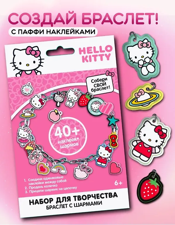 Создай свой браслет Хеллоу Китти на руку из аксессуаров. Почувствуй себя дизайнером! В наборе бижутерии есть все необходимое для создания оригинального модного украшения для девочки. Это браслет с карабином (20 см, длина регулируется), колечки более 20 шт. и паффи наклейки более 40 шт. Собрать браслет своими руками очень просто: необходимо соединить между собой все парные стикеры, продеть колечки, подвесить на браслет и украшение готово! Браслет c хэлоу кити регулируется по длине. В итоге ребенок получит красивое украшение сделанное своими руками. Набор для создания браслетов с шармами будет прекрасным подарком детям. Подойдет для детских подарков в садик. Ваша маленькая принцесса может пора