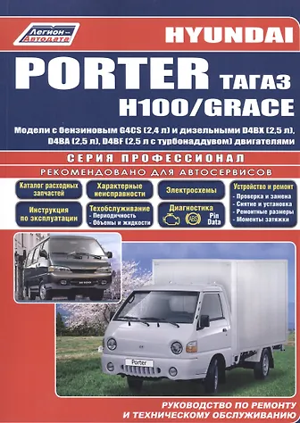 В руководстве дается пошаговое описание процедур по эксплуатации, ремонту и техническому обслуживанию автомобилей HYUNDAI H100, PORTER, GRACE оборудованных дизельными двигателями D4BX (2,5 л), D4BA (2,5 л), D4BF (2,5 л с турбонаддувом) и бензиновым двигателем G4CS (2,4 л). Издание содержит подробные сведения по диагностике, ремонту и регулировке двигателя, элементов систем управления дизельными (ТНВД, турбонаддув) и бензиновым (впрыска топлива MFI, зажигания) двигателями, систем запуска и зарядки, инструкции по использованию систем самодиагностики, в т.ч. АКПП и ABS, и рекомендации по регулировке механических и автоматических коробок передач, регулировке и ремонту элементов тормозной системы