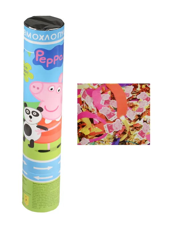 Хлопушка «Peppa Pig» высотой 30 см наполнена фигурным конфетти в виде Свинки Пеппы. Изделие представляет собой металлическую тубу с бумажным наполнением, не содержит пороха, действует на основе сжатого воздуха, безопасно при использовании по назначению. Товар сертифицирован.