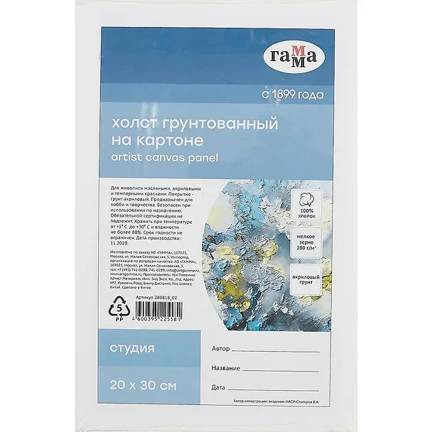 Не первый раз покупаю холсты на картоне от компании Гамма. Удобно, что они бывают разных размеров под различные этюды и виды работ -коллажи, натюрморты, пейзажи. Масло и акрил ложатся хорошо. Для начинающего художника - это самое оно: доступная цена, легкий вес (можно брать несколько штук и рисовать, где угодно). В читай-городе всегда хорошее качество и прекрасное обслуживание.