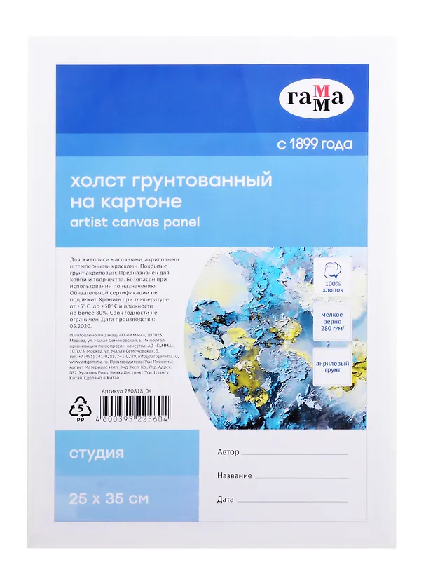 Хлопковый холст ГАММА серии «Студия», грунтованный на картоне, подойдёт для живописи масляными, акриловыми, темперными и гуашевыми красками. Основа – натуральное полотно, 100% хлопок, мелкое зерно. Холст прямоугольной формы плотностью 280 г/м2, размер – 25*35 см. Холст имеет акриловый грунт. Изготовлен без использования кислот.