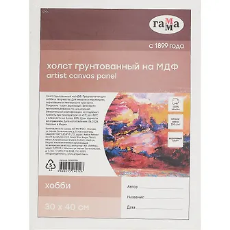 Хлопковый холст на МДФ ГАММА серии «Хобби» подходит для этюдов, учебных работ, работ на пленэре и в студии. Отличное решение для живописи масляными, акриловыми, темперными и гуашевыми красками, смешанных техник. Основа – натуральное полотно, 100% индийский хлопок, мелкое зерно. Холст прямоугольной формы плотностью 250 г/м2, размер – 30*40 см. Холст покрыт трёхслойным акриловым грунтом. Изготовлен без использования кислот. Основа холста – МДФ, прочный и долговечный материал. • плотность 250 г/м²; • мелкое зерно • 100% хлопок; • чёрный акриловый трёхслойный грунт; • материал основы - МДФ