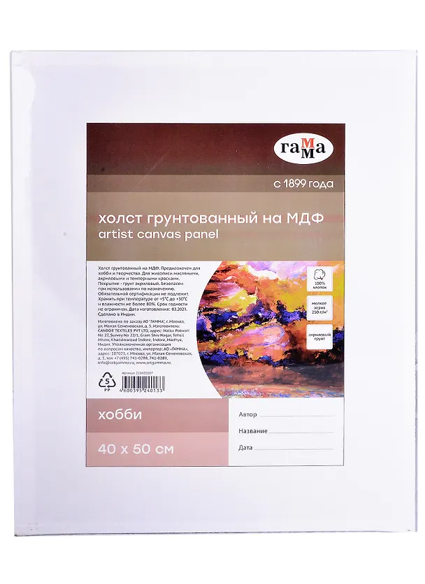 Холст на МДФ 40*50см "Хобби", 100% индийский хлопок, 250 г/м2, мелкое зерно, Гамма