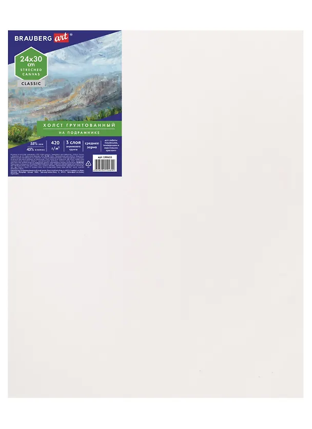 Холст на подрамнике 24*30см грунт., 45%хлоп., 55%лен, среднее зерно, BRAUBERG ART CLASSIC