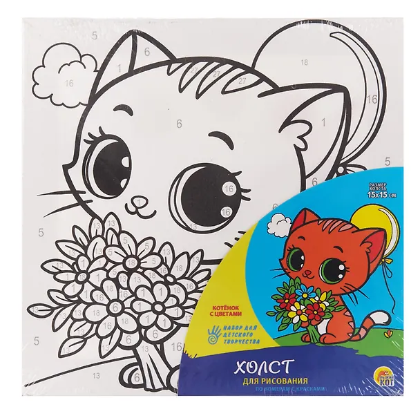 Вашему вниманию предлагается Набор для детского творчества. Холст для рисования по номерам с красками "Котёнок с цветами"