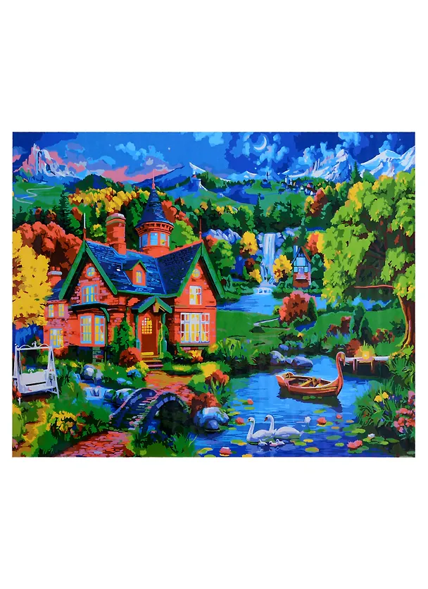 Холст с красками "Сказочный ночной вид на дома и горы", 40х50