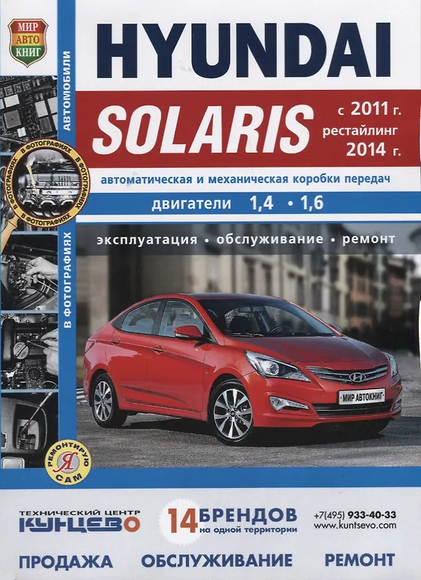 Иллюстрированное руководство содержит подробную информацию по вопросам повседневной эксплуатации, регулярного технического обслуживания и текущего ремонта автомобилей Hyundai Solaris выпуска с 2011 года, рестайлинг 2014 года, с двигателями 1,4 и 1,6; автоматическая и механическая коробки передач.