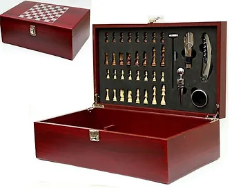Набор подарочный состоит из деревянной (МДФ) коробки, на крышке которой расположено поле для игры в шахматы. Включает в себя набор шахмат из древесины сосны, нож сомелье из нержавеющей стали, пробку для бутылок из цинкового сплава, кольцо для бутылки из нержавеющей стали, термометр для вина (стеклянный, жидкостный). Предусмотрено отделение для 2-х бутылок вина.