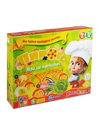 Игра на магнитах включает в себя: сюжетно-ролевую игру (создай свой самый первый кулинарный шедевр) и настольную игру со стрелочкой (Маша предлагает выбрать самого быстрого, умелого и везучего кулинара).
