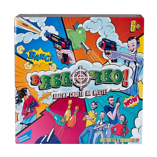 Простая и активная настольная игра для всей семьи. Игроки при помощи пистолетов пытаются попасть в одну из трёх, разнесенных на разное расстояние мишеней. Мишени оформлены в забавном игровом стиле. Но прежде чем это сделать участникам необходимо выполнить определенное задание: встать на одну ногу, повернуться вокруг своей оси 3 раза, выстрелить не глядя и пр. Всего в игре 24 оригинальных задания, которые имеют как командный, так и одиночный режим.