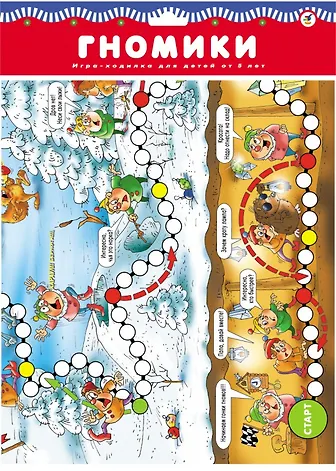 Игры-ходилки самые простые, но всё равно азартные. Особенно, если в коробочке лежит приз за первое место )) Игра напечатана на картоне размером 48х55 см, путь длинный - гномы спешат к деду Морозу, правила обычные (по стрелке вперед, по стрелке назад и желтый кружок - пропусти ход). Иллюстрации яркие, замечательные, огромная благодарность художнику. Много на рисунках смешных ситуаций, которые веселят детей. В ходилке не надо думать, просчитывать ход, всё зависит от удачи. Это самый настоящий отдых! Подобные игры, которые можно было разглядывать бесконечно долго, обнаруживая всё новые детали, печатались когда-то в детских журналах.
