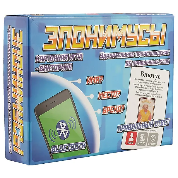 Настольная игра «Эпонимусы» познакомит вас с происхождением иностранных слов, научит быстро принимать решения и разовьёт языковое чутьё. Саксофон, бойкот, кардиган и джакузи – знакомые слова предстанут перед вами в новом свете. Угадайте источник их появления в языке! Это может быть имя исторического персонажа, памятное место или бренд. Докажите, что вы самый эрудированный среди своих близких.