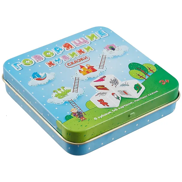 Настольная игра «Говорящие кубики Сказки» в жестяной коробочке (серия «Игры в табакерке»). Состав: пластиковые кубики – 8 шт. (18 х 18 мм), инструкция. Материал: пластик, бумага. Для детей от 3 до 5 лет, для 2–4 игроков. Развивает фантазию, воображение, логику, способность последовательно рассказывать свою сказку.