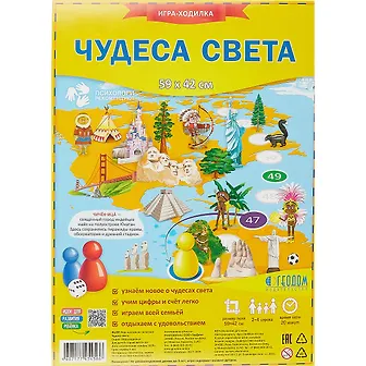 Игра-ходилка, почему-то на обложке написано «психологи рекомендуют». Какие и почему? Но к самой игре претензий нет, поле большое (42 на 60 см). Картинки добрые, рассматривать интересно, познавательно для детей, на карте также обозначены современные чудеса света типа статуи Христа Спасителя в Рио-де-Жанейро. Надписи к чудесам небольшие, но для первого знакомства хватит. Будьте готовы отвечать на детские вопросы и показывать дополнительные картинки.