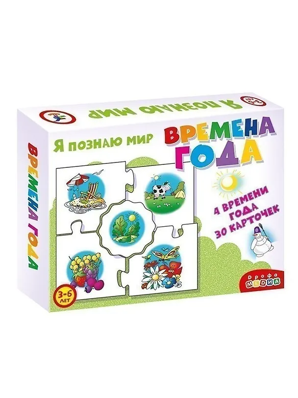 Игра знакомит ребенка с сезонными изменениями, учит сравнивать предметы, анализировать информацию, устанавливать закономерности, развивает наблюдательность, интерес к окружающему миру, навыки самоконтроля. Задача игрока собрать вокруг центральной карточки с изображением одного из времён года четыре карточки с явлениями, характерными для этого периода. Фигурная форма карточек поможет проверить, правильно ли подобраны картинки: если допущена ошибка, пазловый замок не соединится.
