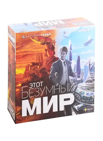 "Этот безумный мир" – настольная игра для опытных игроков с механиками драфта и создания карточного движка. На этапе драфта игроки выбирают карты, а затем строят из них цепочки производства ресурсов или победных очков.