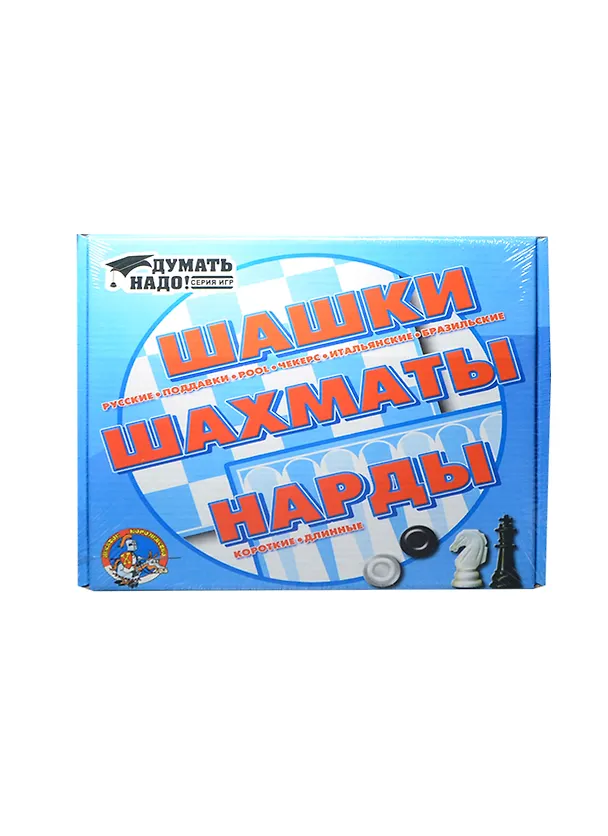 Три игры в одной коробке! В комплект входят: 1. Жесткое двустороннее поле размером 210х190 мм. 2. Маленькие пластмассовые шашки - 30 шт (15 белых и 15 черных). 3. Небольшие пластмассовые шахматные фигурки 32 шт. (16 белых фигур и 16 черных), высотой от 2,5 см (пешки) до 4,5 см (король). 4. Два кубика. 5. Правила игры в нарды. Разнообразные варианты игры в шашки размещены на коробке с обратной стороны. Это и "Русские шашки", и "Поддавки", и "Чекерс", и "Бразильские шашки", и "Итальянские шашки".