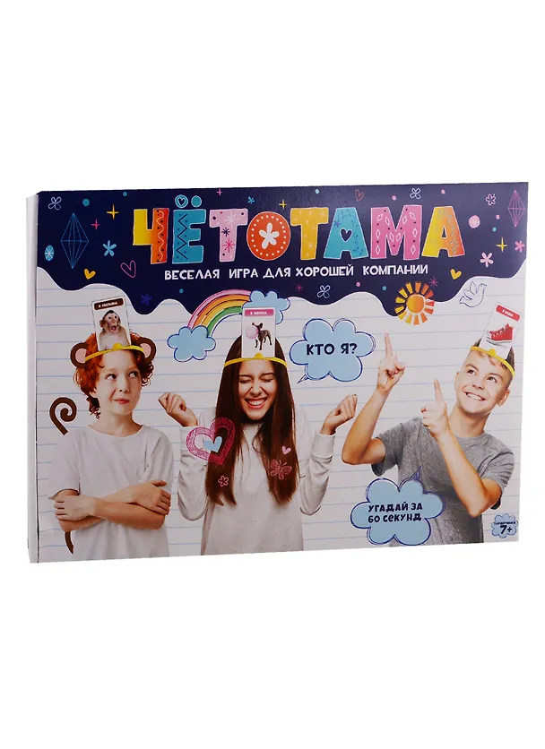 Настольная развлекательная игра «Чётотама». Состав: диадемки-держатели – 8 шт., карточки с рисунками – 36 шт. (7,5 х 10,5 см), песочные часы на 1 мин. (высота – 9 см), шляпная резинка (2,5 м). Материалы: картон, пластик, текстильный шнур. Для детей от 7 лет, от 2-х игроков. Развивает логику и аналитические способности.