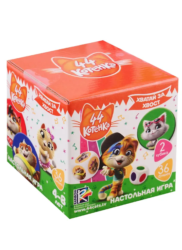 На поле раскладываем фишки с котятами лицевой стороной вверх. Подбрасываем поочередно оба кубика. Сначала с изображением цвета, а затем – персонажа. Ищем нужную нам фишку, соответствующую комбинации на кубиках. Например, красный и Пилу. Кто найдет первым – хватает скорее себе!