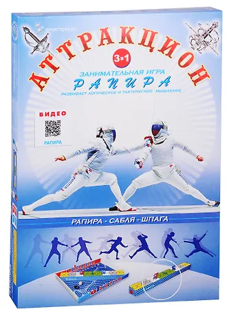Серия сборных игрушек «Аттракцион» из картона с деталями из пластмассы, развивает логическое и тактическое мышление. Игра состоит из 3 игр: рапира, сабля и шпага. Все игры отличаются друг от друга и каждаю интересна по своему, т к повторяет настоящий Олимпийский вид спорта.