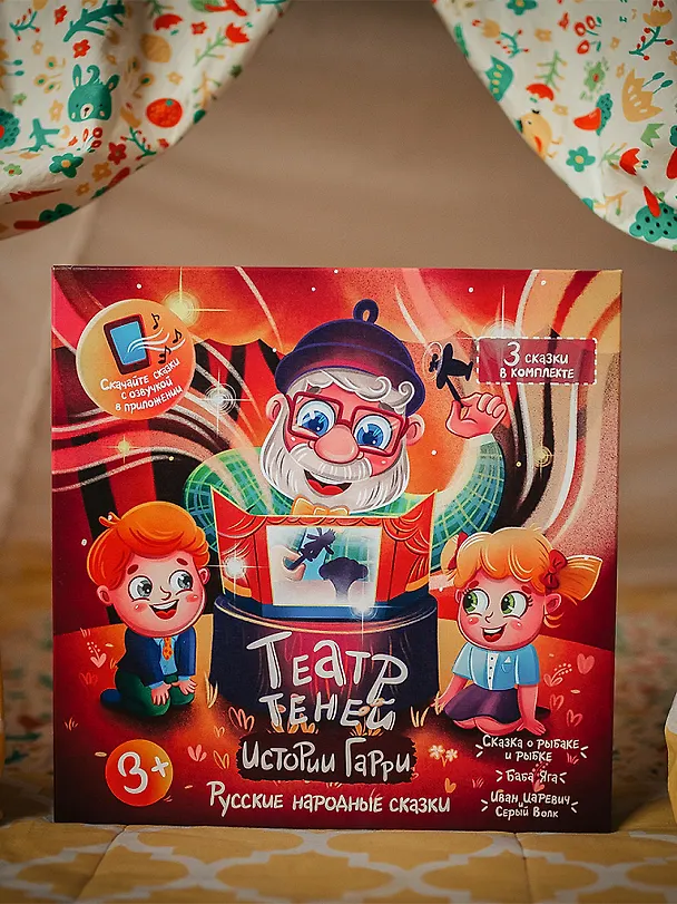 Настольная игра "Театр теней Истории Гарри" — это развивающая игра для детей, с помощью которой можно устроить захватывающее театральное представление при помощи бесплатного мобильного приложения с аудиосюжетами сказок и театральной ширмы, подставки для телефона, входных билетов и 3 комплектов фигурок с декорациями.